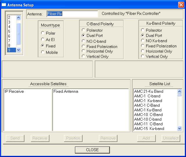 First we are going to add two antennas; one for transmit and one for receiver. This is the normal process of adding a new antenna to the CompuSat site data. Detailed instructions can be found here. If yo do not have any encoders in your system, you only need to add the receive antenna. For the receive antenna, add the IP Receive satellite to the accessible satellite list. For the transmit antenna, add the IP Transmit satellite.
