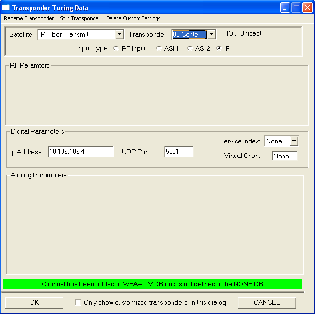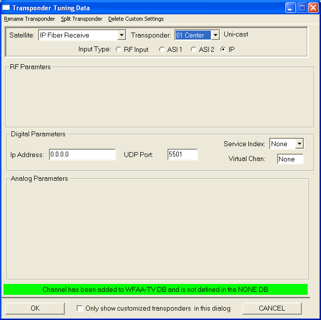 To add a new channel, pick a new channel from the transponder list. Use the Rename menu choice to assign an appropriate name. Clip on the IP radio button to define the input type for this channel and then enter the multi-cast IP address and UDP port number.
