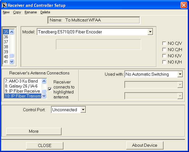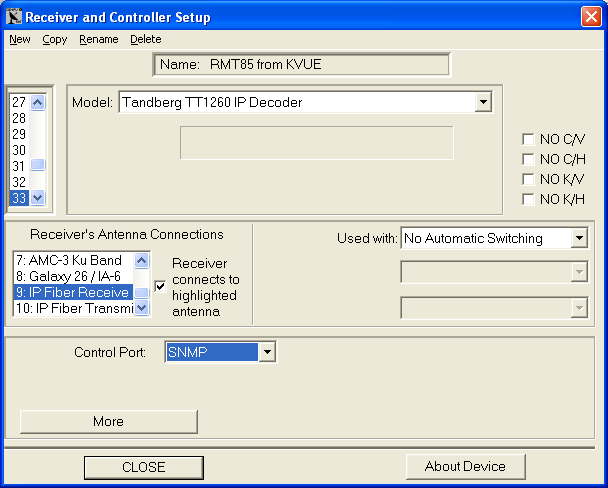 Next we need to add each decoder and encoder you want to control. These are added using the same procedure as adding a normal satellite receiver. We will attach all the decoders to the Receive Antenna and all the encoders to the Transmit Antenna.